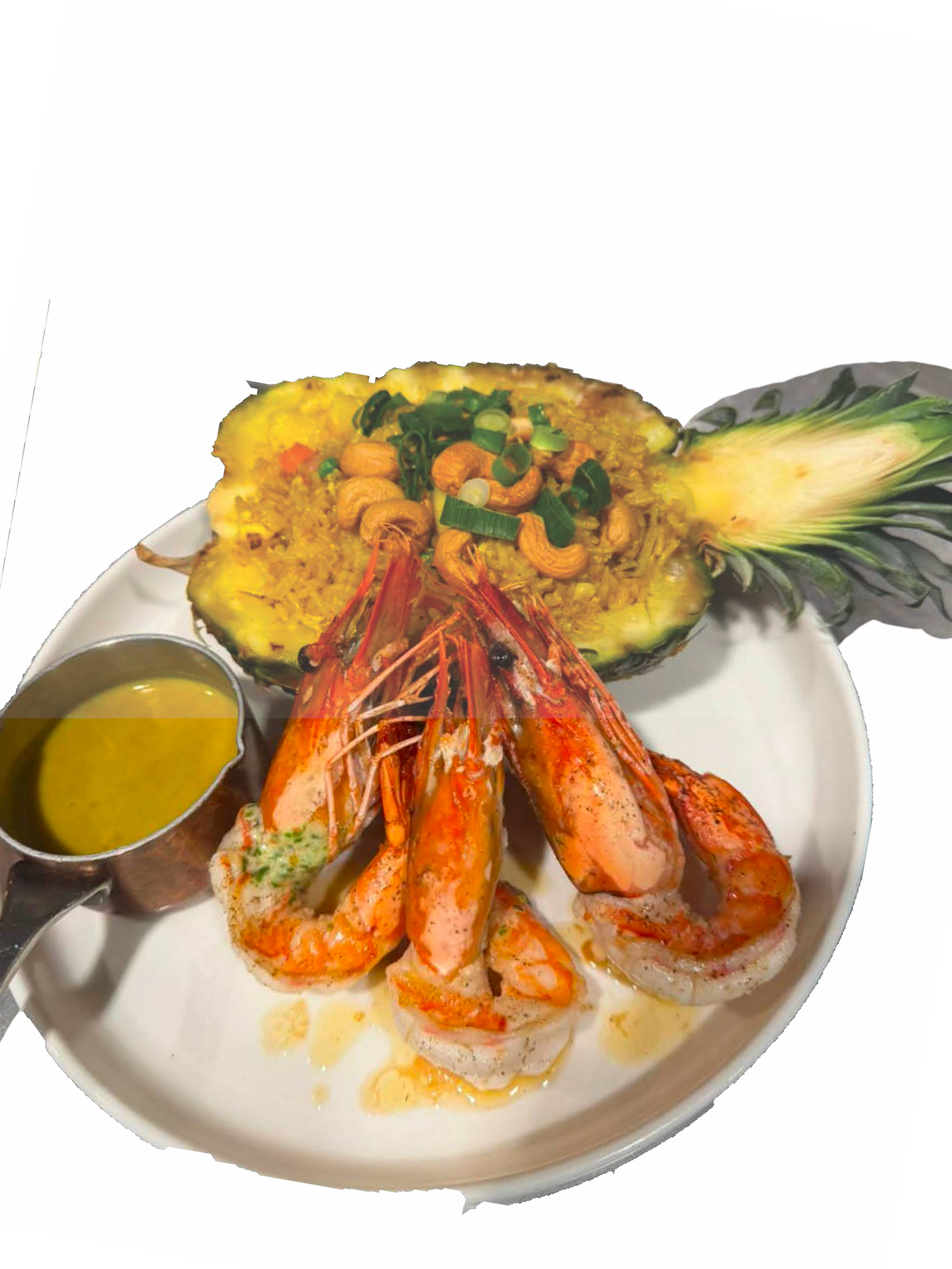 Gamba / gevulde ananas /gebakken rijst / ham / gele curry